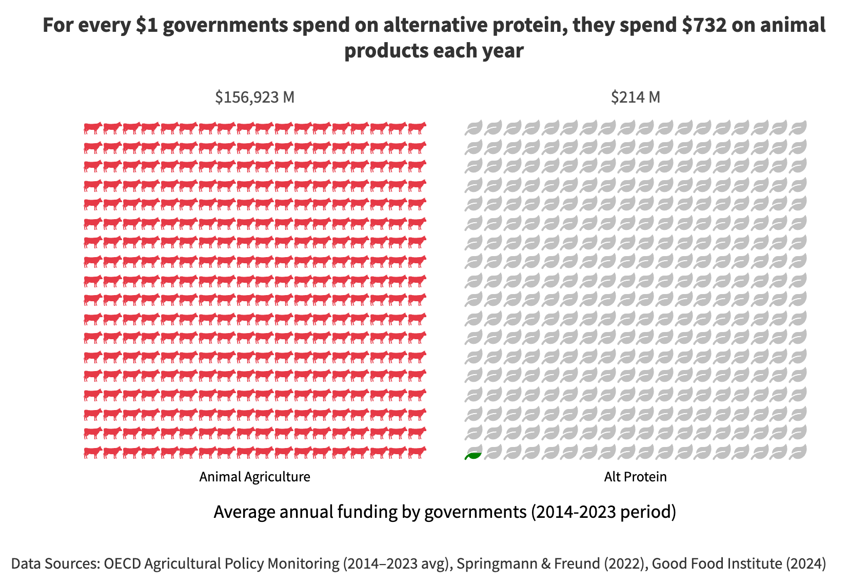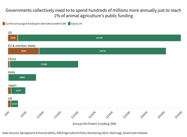 This funding disparity between animal agriculture and better alternatives shows up across every major agricultural economy. While alternative proteins account for roughly around 1% of global market share, they don't get close to 1% of the $156B that governments spend on animal products annually.