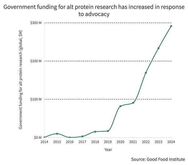 Second, we know it responds to advocacy. Ten years ago, governments were spending almost nothing on alternative protein research. That changed because advocates and researchers made the case that protein diversification is a public good. Since 2014, global public funding for alternative protein R&D has grown from essentially zero to around $290 million in 2024, raising its share of agricultural R&D from 0% to about 1.8% (based on the most recent global data for 2024) [2]